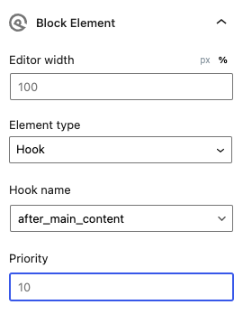 - In the block element setting choose “Hook” for the element type