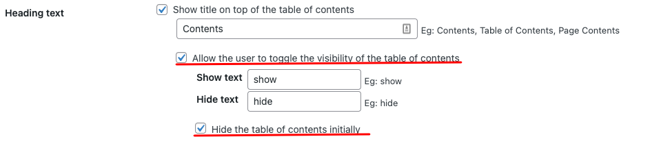 In table of contents plus, you will find an option to allow the user to toggle the visibility of the table of contents and to hide the table of contents initially.