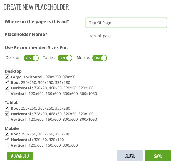 - The Ezoic team created 24 placeholders for me. I have 22 here, I didn’t include the “sidebar floating” and one more on top of the page”