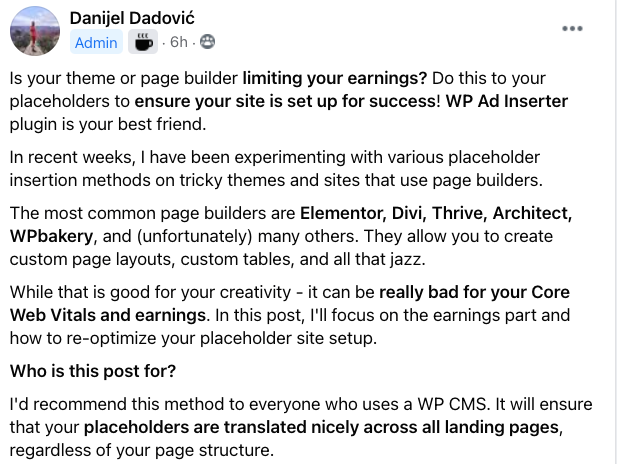 If you have smart questions, you can ask questions in his group, he works for Ezoic and the few interactions that I have had with him in the group or by email make me think that he really likes to help publishers.
