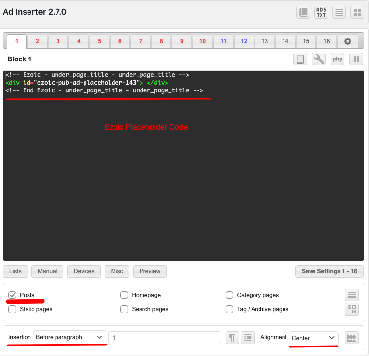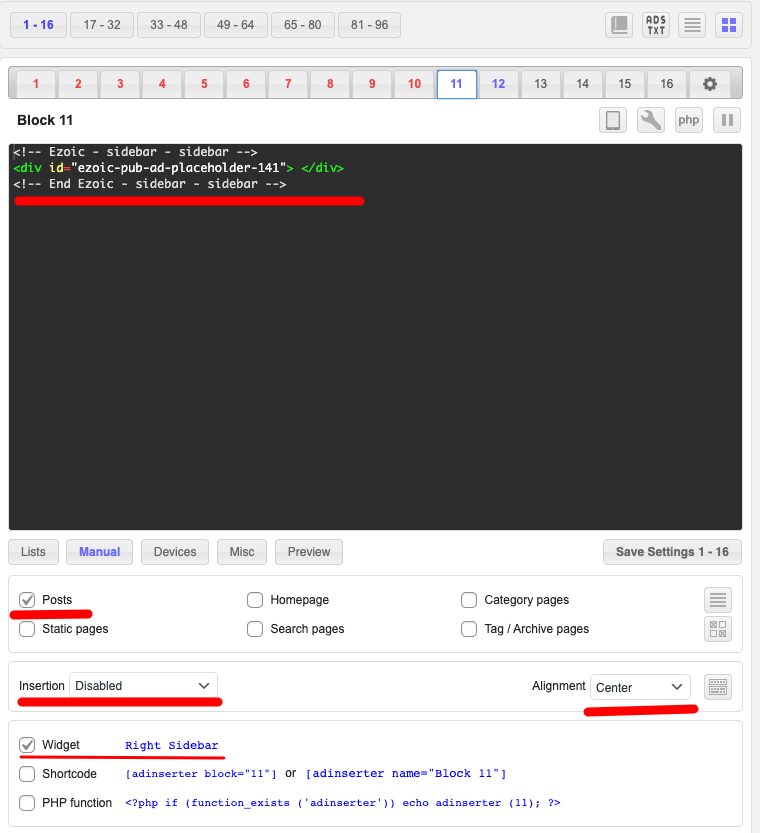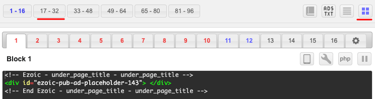 Do the same with all the placeholders you created, if you have more than 16 placeholders ready to be added you can click a button with four squares on your left and you will see the option to use the rest of 80 blocks available in Ad Inserter
