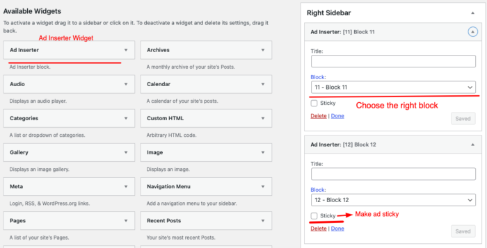 Once you have the Ad Inserter Widget in your sidebar, choose the right block and make one of the widget sticky.