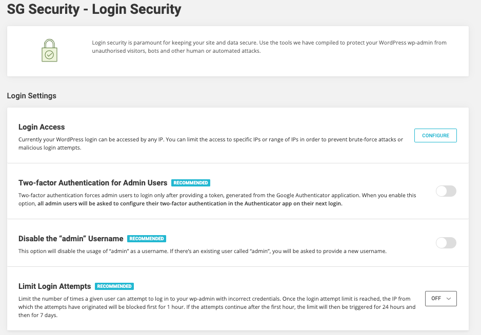 The Login Security also has a pretty clean interface. There are a couple of options that you can switch on and off and some options that you have to configure.